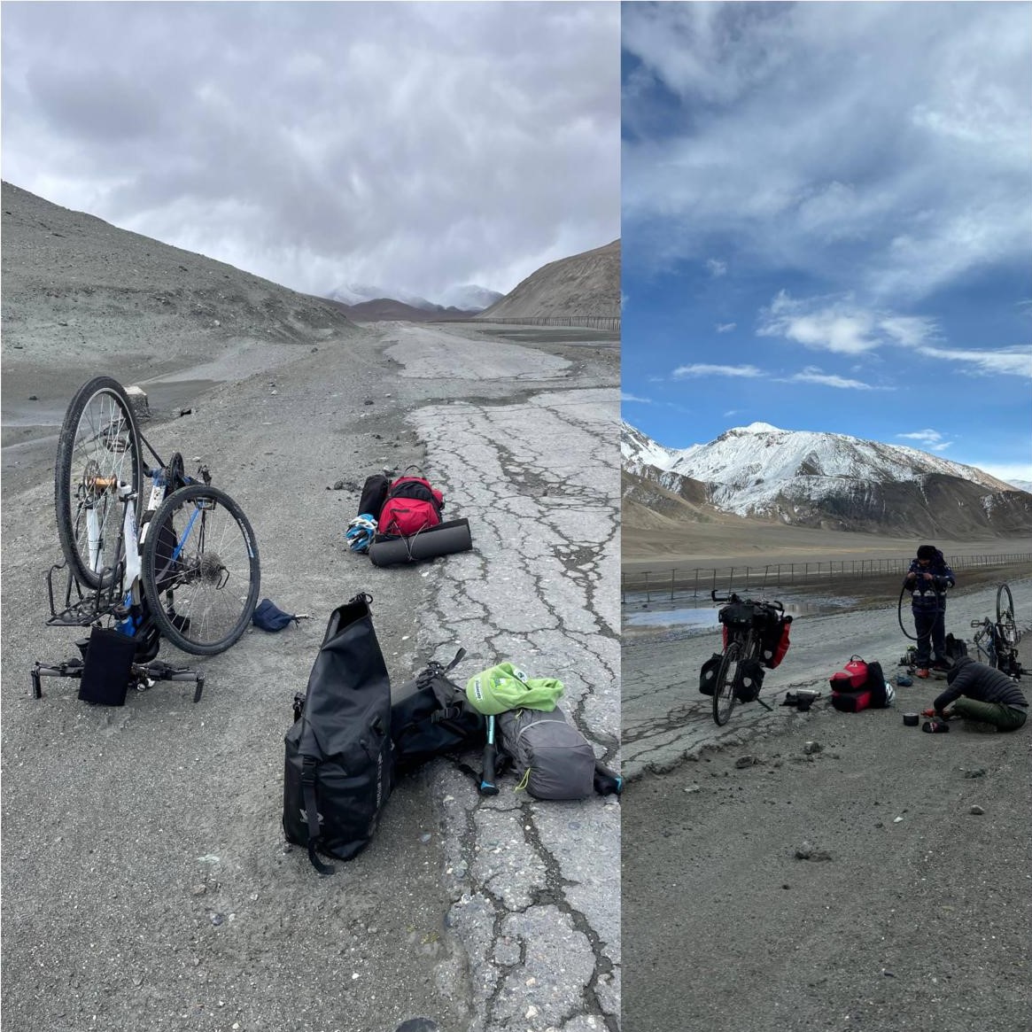 Тәжікстан аумағы, теңіз деңгейінен 4000 км биіктікте орналасқан, бұзылып қалған велосипед дөңгелегін жөндеу барысы