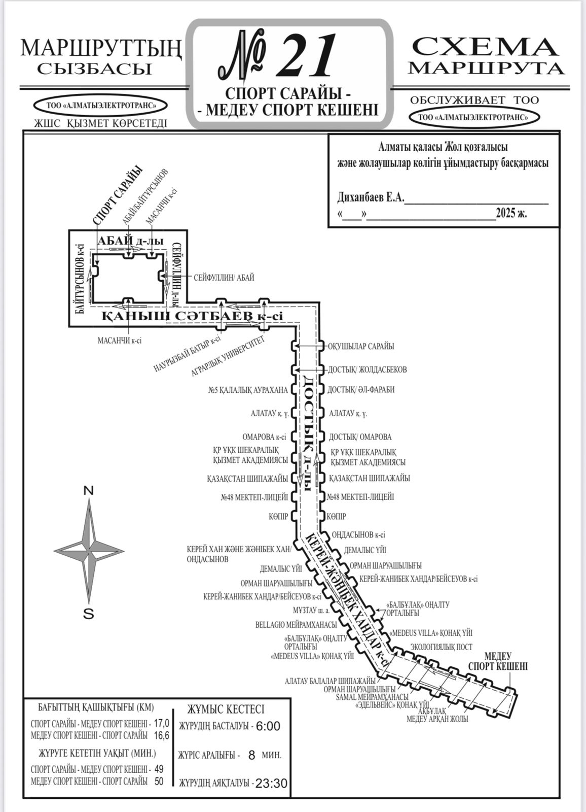 Алматыда тұрғындар мен қала қонақтарының қатынау мүмкіндігін арттыру мақсатында биыл 27 қарашадан бастап «Спорт сарайы – Медеу спорт кешені» бағыты бойынша жаңа, тұрақты №21 автобус маршруты іске қосылады, - деп хабарлайды Aqshamnews.kz.