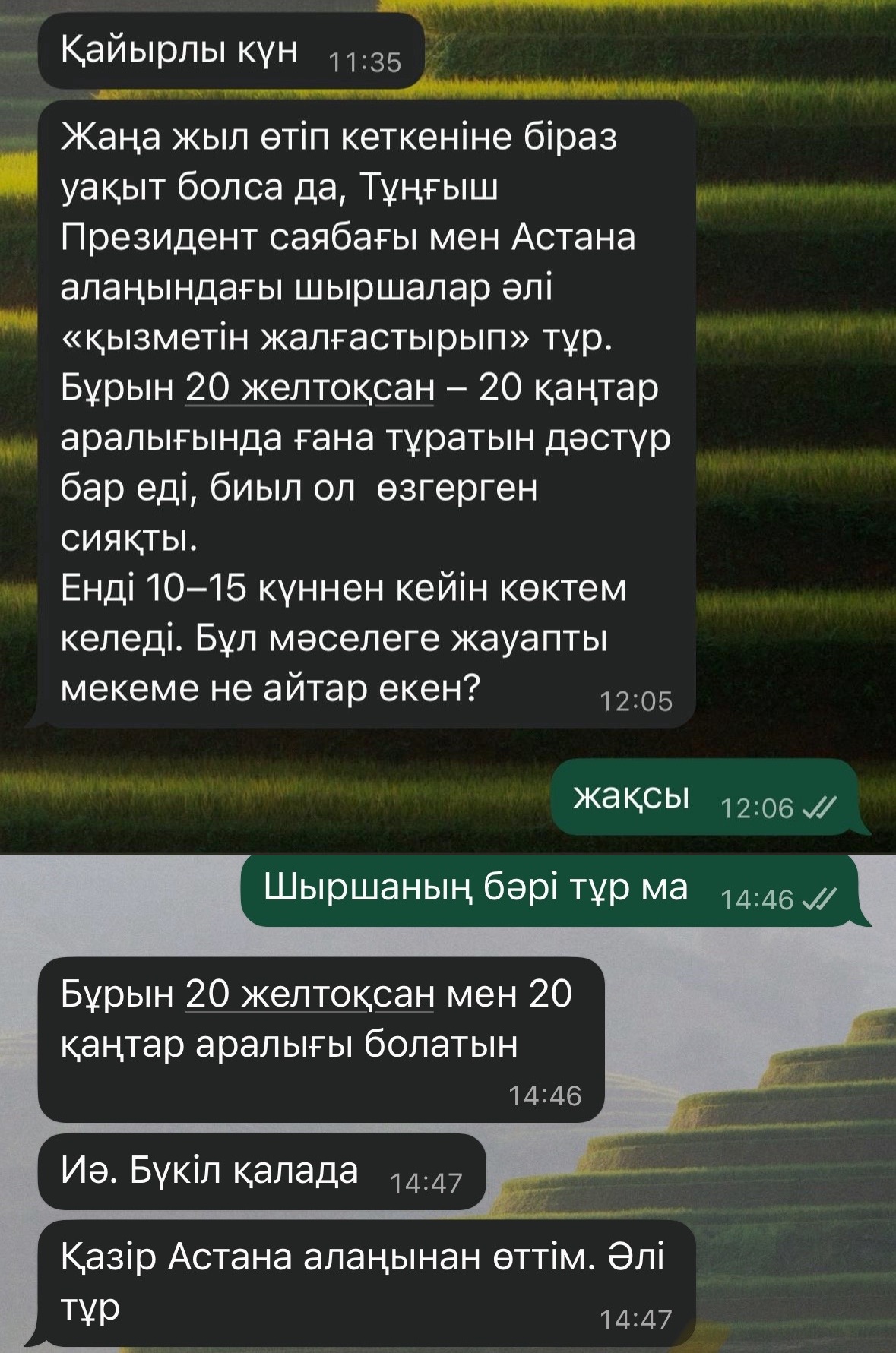 Осыған байланысты редакциямызға қала тұрғындарынан Жаңа жыл мерекесі қарсаңында орнатылған шыршаларға қатысты сұрақтар келіп түсе бастады. Тұрғындардың айтуынша, шамамен бір жарым ай бұрын қойылған шыршаларды жинайтын уақыт әлдеқашан жеткен.