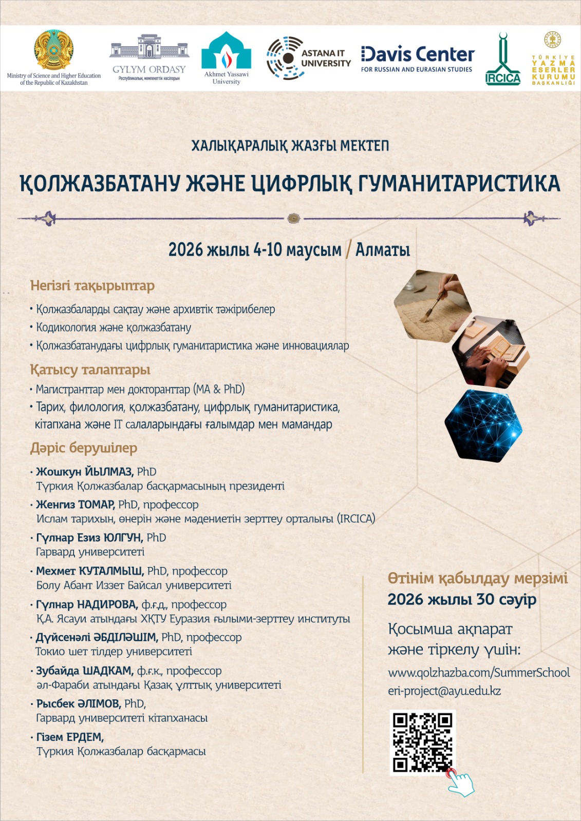 «Қолжазбатану және цифрлық гуманитаристика» халықаралық жазғы мектебі аталған мәселелерді шешуге бағытталған. Бағдарлама жас және тәжірибелі мамандарға арнайы теориялық және практикалық курс мүмкіндігін ұсынып, қолжазбаларды сақтау, реставрациялау және цифрлық гуманитаристика әдістеріне басымдық береді. Халықаралық және отандық тәжірибені ұштастыра отырып, сала бойынша танымал жетекші сарапшыларды шақырған бұл жазғы мектеп қатысушылардың, әсіресе Қазақстан мен Орталық Азияның қолжазба дәстүрлері мен оның заманауи ғылыми қолданысына деген қызығушылығы мен түсінігін тереңдетуді мақсат етеді.