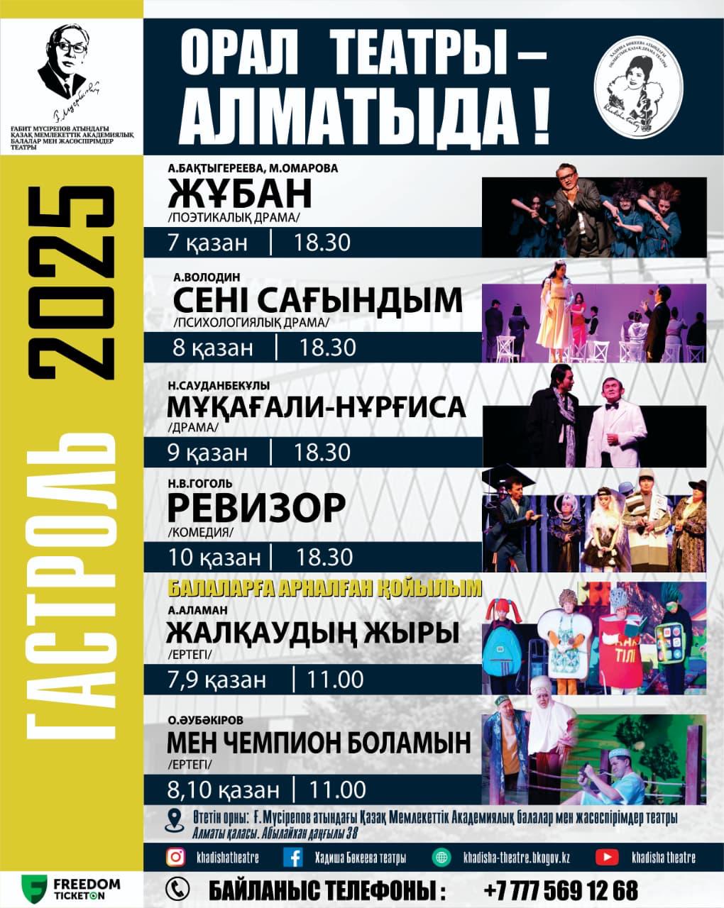 Аталмыш ұжым 2025 жылдың 7, 8, 9, 10 қазан күндері Алматы қаласында гастрольдік сапарда болады. Өнерсүйер қауымға театр репертуарындағы таңдаулы классикалық, әлемдік және заманауи драматургиядан үздік қойылымдарын және кішкентай көрермендерге арналған ертегілерін ұсынады. Сонымен қатар биылғы жылы рухты ақын Жұбан Молдағалиевтің 105 жылдығы мен Нұрғиса Тілендиевті 100 жылдығы аясында тұлғалардың асыл мұрасын насихаттап, жас буынға елдік рух пен мәдени құндылықты жеткізу мақсатында қойылған спектакльдер де бар.