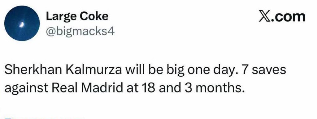 "Шерхан Қалмұрза бір күні ұлы ойыншы атанады. 18 жас, 3 айында "Реалға" қарсы ойында 7 сейв жасады" деп жазды Large Coke.