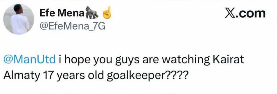 "Манчестер Юнайтед сендер "Қайраттың" 18 жастағы қақпашысын көріп отырсыңдар деген үміттемін???" делінген Efe Mena жазбасында.