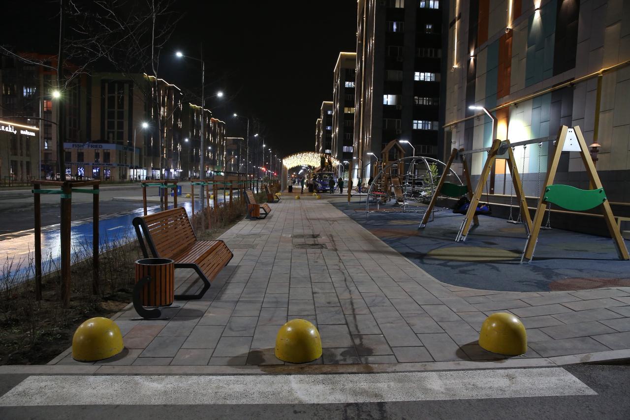 Аймақтың жалпы ұзындығы – 370 метр. Мұнда жүргінші жолдары (2 мың куб. м) және велосипед жолақтары (1200 куб. м), балалар ойын алаңы, баскетбол алаңы, воркаут-аймағы және шағын амфитеатр орнатылған. Сондай-ақ шағын сәулеттік формалар, көше жиһазы, автоматты суару жүйесі және жарықтандыру элементтері қарастырылған. Көгалдандыру аясында 200 ірі ағаш және 4500 бұта отырғызылды, 30 орындық, 30 қоқыс жәшігі және 28 шағын сәулеттік форма орнатылды.