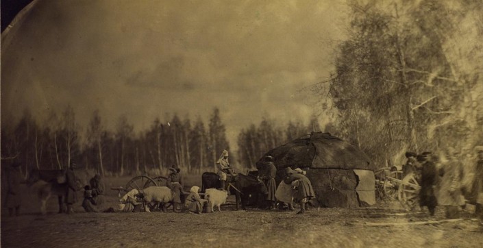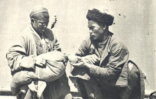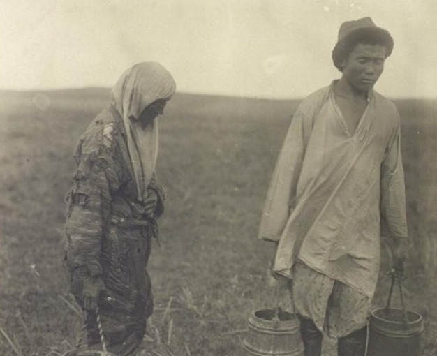 Суретте жалдамалы жұмысшылар бейнеленген. Киіміне қарағанда өз малы жоқ, бай қазақтың жалшылары болуы мүмкін.
