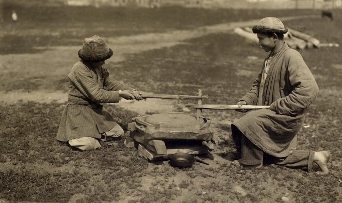 Екі жасөспірім қол диірмен арқылы ұн тартып жатыр.