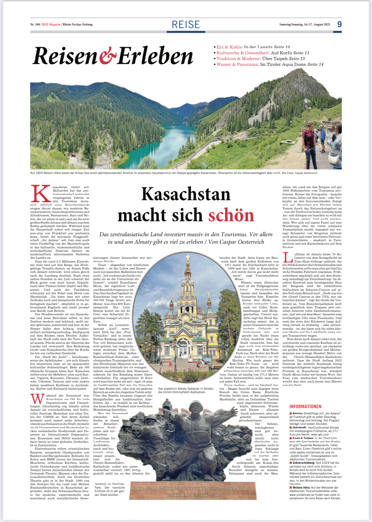 Неміс басылымының бұл мақаласы Еуропаның Қазақстанға деген қызығушылығының артып келе жатқанын тағы бір мәрте паш етті. Мақала авторының сапары Almaty Tourism Bureau қолдауымен және Air Astana әуе компаниясының серіктестігімен жүзеге асқан. Компания Франкфурт пен Алматы арасында тікелей әуе қатынасын орындайды.