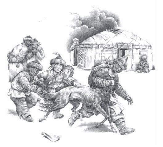 Суретте иткөйлек байланған итті қуалау сәті бейнеленген. Авторы: Оспанұлы Е. "Қазақ халқының салт-дәстүрлері. Балалық шақ, үйлену. Графика " (Алматы, 2009) атты еңбектен.