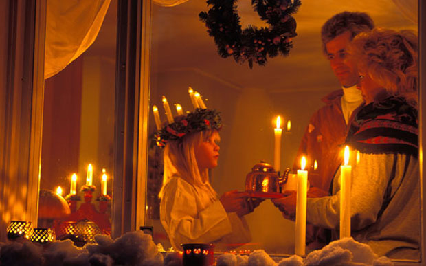 Швецияда Жаңа жыл алдында балалар "Жарық патшайымы" Лючияны сәндейді. Оған ақ көйлек кидіріп, басына шам жағылған тәж тақады. Лючия балаларға сыйлықтар әкеліп, үй жануарларына да тәттілер береді. Мысалы, мысыққа - қаймақ, итке - қанттан жасалған сүйек, есекке - сәбіз. Мерекелік түнде үйлерде жарық сөнбейді, ал көшелер жарықпен әсемделеді.
