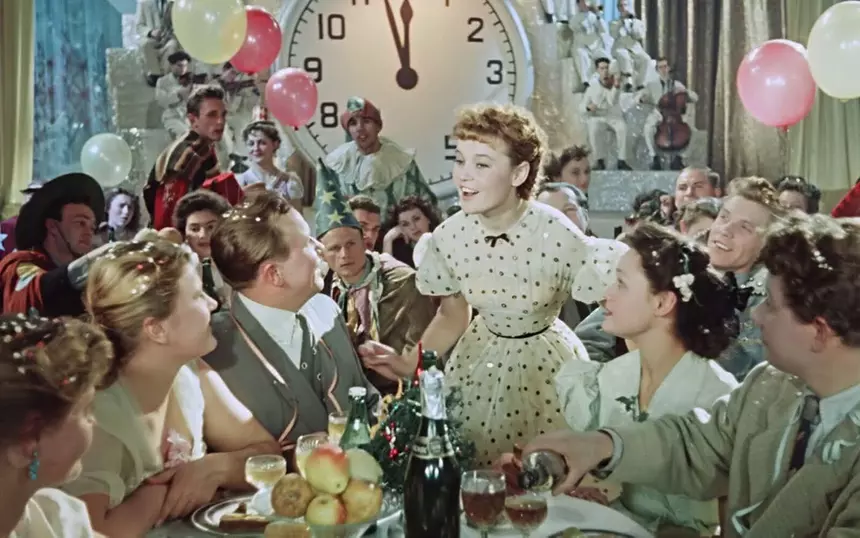 «Карнавальная ночь» (1956) – Эльдар Рязанов түсірген музыкалық комедия. Людмила Гурченко ойнаған, әйгілі «Бес минут» әнімен есте қалған туынды. Жастардың жаңа жыл кешін еркін әрі көңілді өткізгісі келуі мен ескіше ойлайтын басшылықтың арасындағы қақтығыс юмор арқылы көрсетіледі. Фильм оптимизмге толы, жаңа жылдың рухын айқын сездіреді.