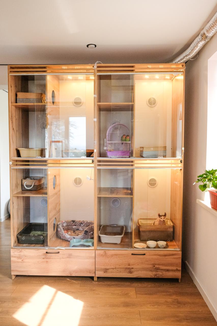 Біздің қонақүйдегі әрбір үйшік ұзындығы мен ені бір метрлік квадрат пішінді және жеке желдеткіш, сорғыш жүйесімен, жарықпен және 24/7 жұмыс істейтін түнгі көрінісі бар бейнебақылаумен жабдықталған. Үйшіктердің ауасы әрдайым таза әрі жаңарып тұрады, іші жылы, жел соқпайды. Әр үйшік қонақ бөлме, әжетхана және ұйықтайтын бөлме сияқты үш бөлікке бөлінген. Қонақүйдің ішінде Жапонияның FUNAI маркалы сорғыш желдету жүйесі және SHARP ауа тазартқышы мен ионизаторы бар. Мысықтарға арналған жалбыз иісті ауа ылғалдандырғыштар жұмыс істейді.
