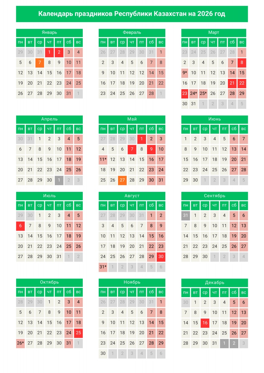 Жұмыс және демалыс күндерінің нақты бөлінісі еңбек демалысының кестесін жасау, жалақыны есептеу және іскерлік белсенділікті жоспарлау кезінде пайдаланылады. Жұмыс берушілер мен қызметкерлерге 2026 жылға арналған жұмыс кестесін құру кезінде мерекелік күндер күнтізбесін ескеруге кеңес беріледі.