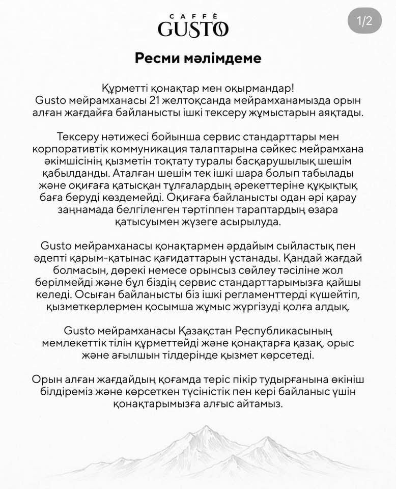 "Тексеру нәтижесі бойынша сервис стандарттары мен корпоратив коммуникация талаптарына сәйкес мейрамхана әкімшісінің қызметін тоқтату туралы басқарушылық шешім қабылданды. Бұл шешім - тек ішкі шара және оқиғаға қатысқан тұлғалардың әрекеттеріне құқықтық баға беруді көздемейді. Оқиғаға байланысты одан әрі қарау заңнамада белгіленген тәртіппен тараптардың өзара қатысуымен жүзеге асырылып жатыр. Gusto мейрамханасы қонақтармен әрдайым сыйластық пен әдепті қарым-қатынас қағидаттарын ұстанады. Қандай жағдай болмасын, дөрекі немесе орынсыз сөйлеу тәсіліне жол берілмейді және бұл біздің сервис стандарттарымызға қайшы келеді. Осыған байланысты біз ішкі регламенттерді күшейтіп, қызметкерлермен қосымша жұмыс жүргізуді қолға алдық. Болған жағдайдың қоғамда теріс пікір тудырғанына өкініш білдіреміз және көрсеткен түсіністік пен кері байланыс үшін қонақтарымызға алғыс айтамыз", - делінген жазбада.