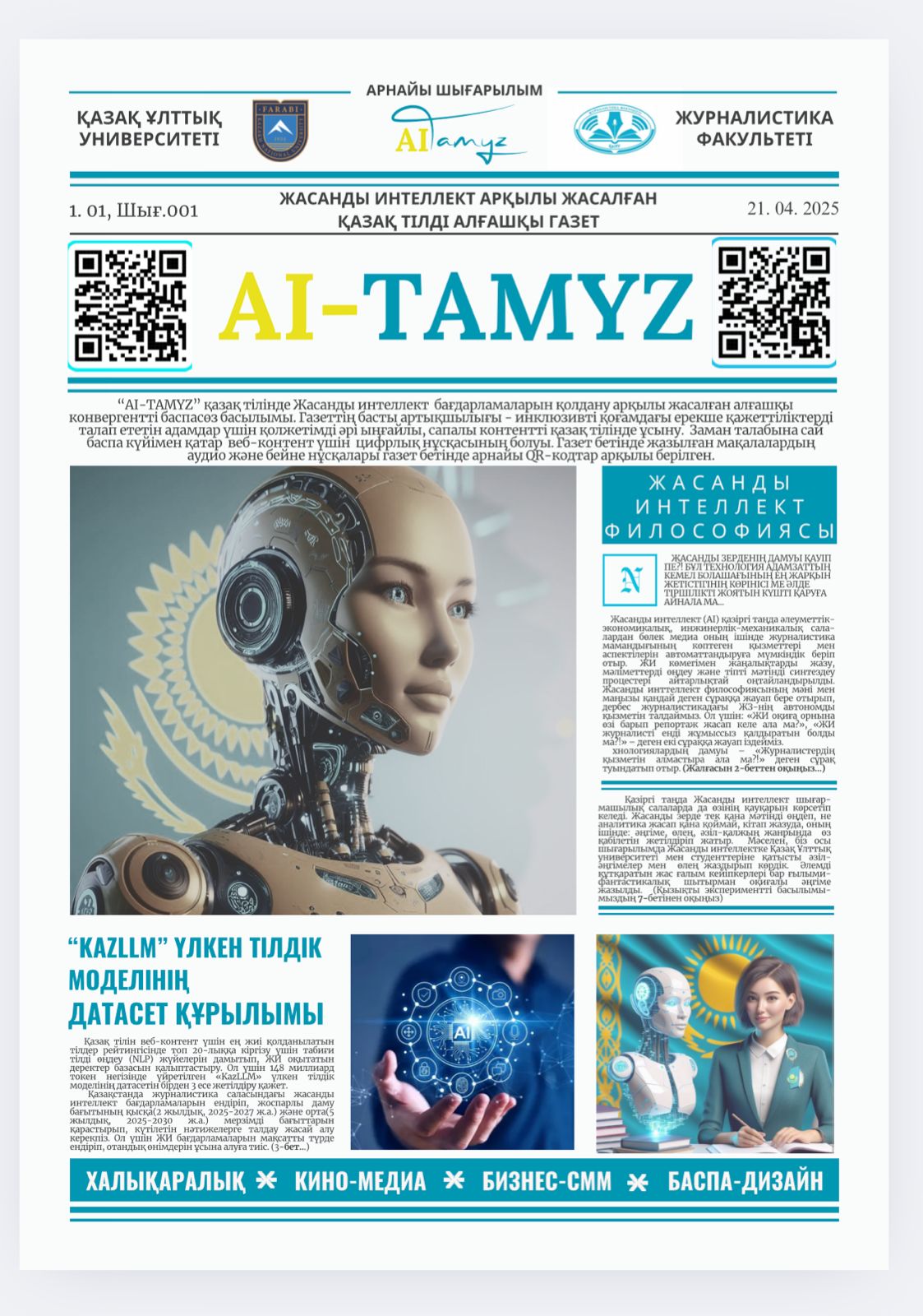 Ai-Tamyz konvergentti jasandy ıntellekt gazetiniń redaktory Nur-Altaı Ómirzaqtyń aıtýynsha, gazettegi mátinder men ılústrasıalar neıromodelder arqyly generasıalanǵan. Jasandy ıntellekt kómegimen ár materıaldyń aýdıo jáne vıdeo nusqasy da jasalyp, QR-kodtar arqyly gazet betine engizilgen.