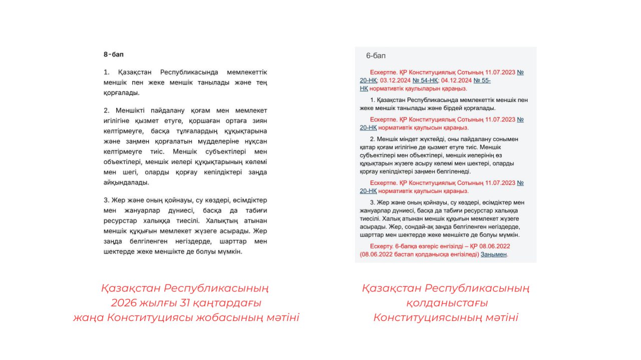 Ortalyqtyń túsindirýinshe, qoldanystaǵy Konstıtýsıanyń 6-babynyń 3-tarmaǵyndaǵy jer jáne tabıǵı resýrstarǵa qatysty norma jańa Konstıtýsıa jobasynda da esh ózgerissiz saqtalǵan. Atalǵan talaptardyń ózgermeıtini Konstıtýsıalyq reforma jónindegi komısıa tarapynan da rastalǵan.