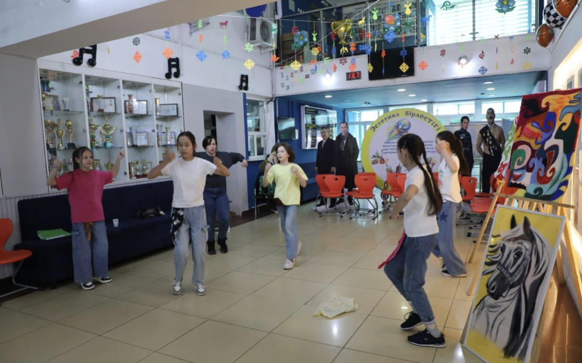 T. Júrgenov atyndaǵy Óner akademıyasyndaǵy uchaskede arnaıy jabdyqtalǵan aımaqta balalarǵa arnalǵan úlken árí qyzyqty boyau pannosy ornatyldy.