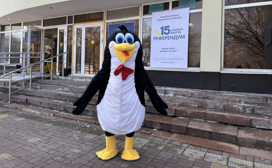 Almatylyqtardyń bírí uchaskege pıngvınníń kostyumín kıíp keldí. Ol bírden kópshílíktíń nazaryn audaryp, onymen bírge suretke túsíp, selfı jasady. Būl keıípker referendumǵa qatysu úshín Antarktıdadan ūzaq jol júríp kelgen «sayahatshy pıngvındí» beıneledí.