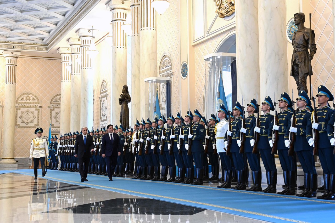 مەмلەكەتتەر باسشىلارى بءىر-بءىرءىنە دەلەگاцييا мءۇشەلەرءىن تانىستىرعان سوڭ قۇرмەت قاراۋىلىنىڭ باستىعى راپورت بەرءىپ, ەكءى ەلدءىڭ بنۇراندارى ورىندالدى.